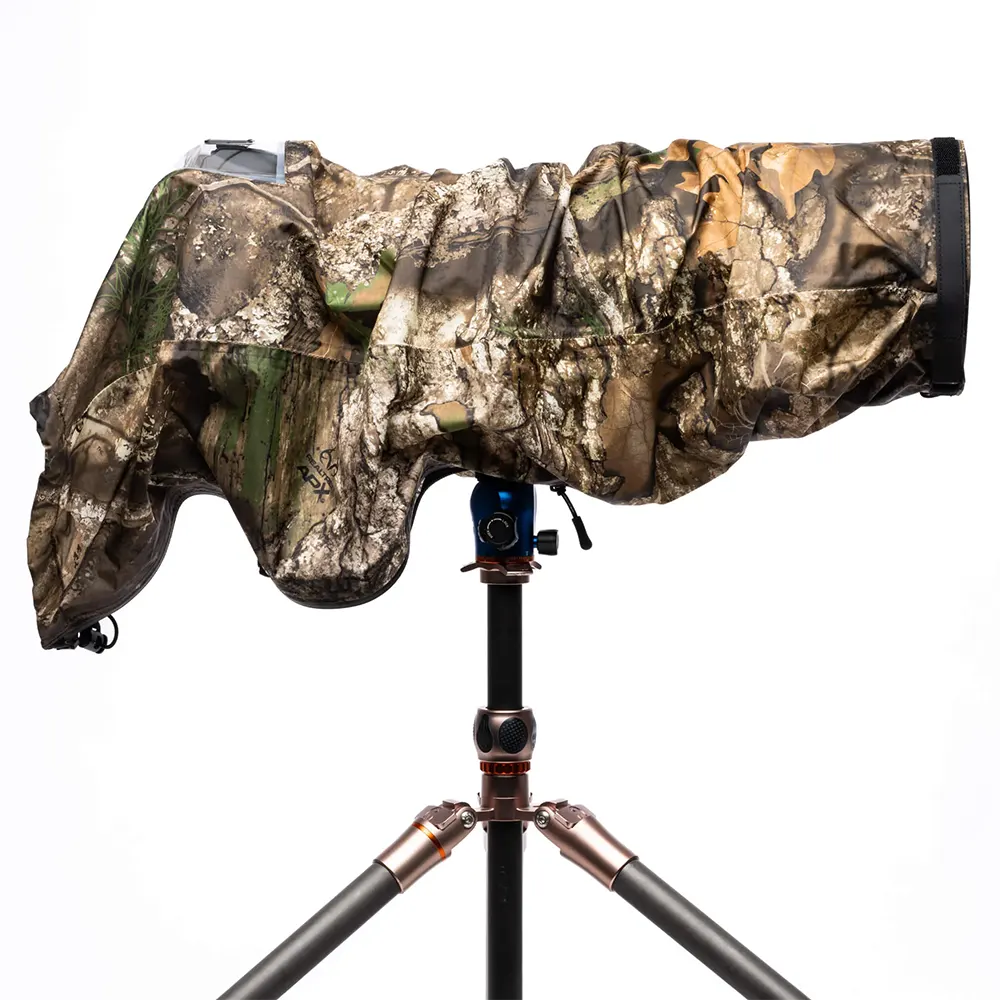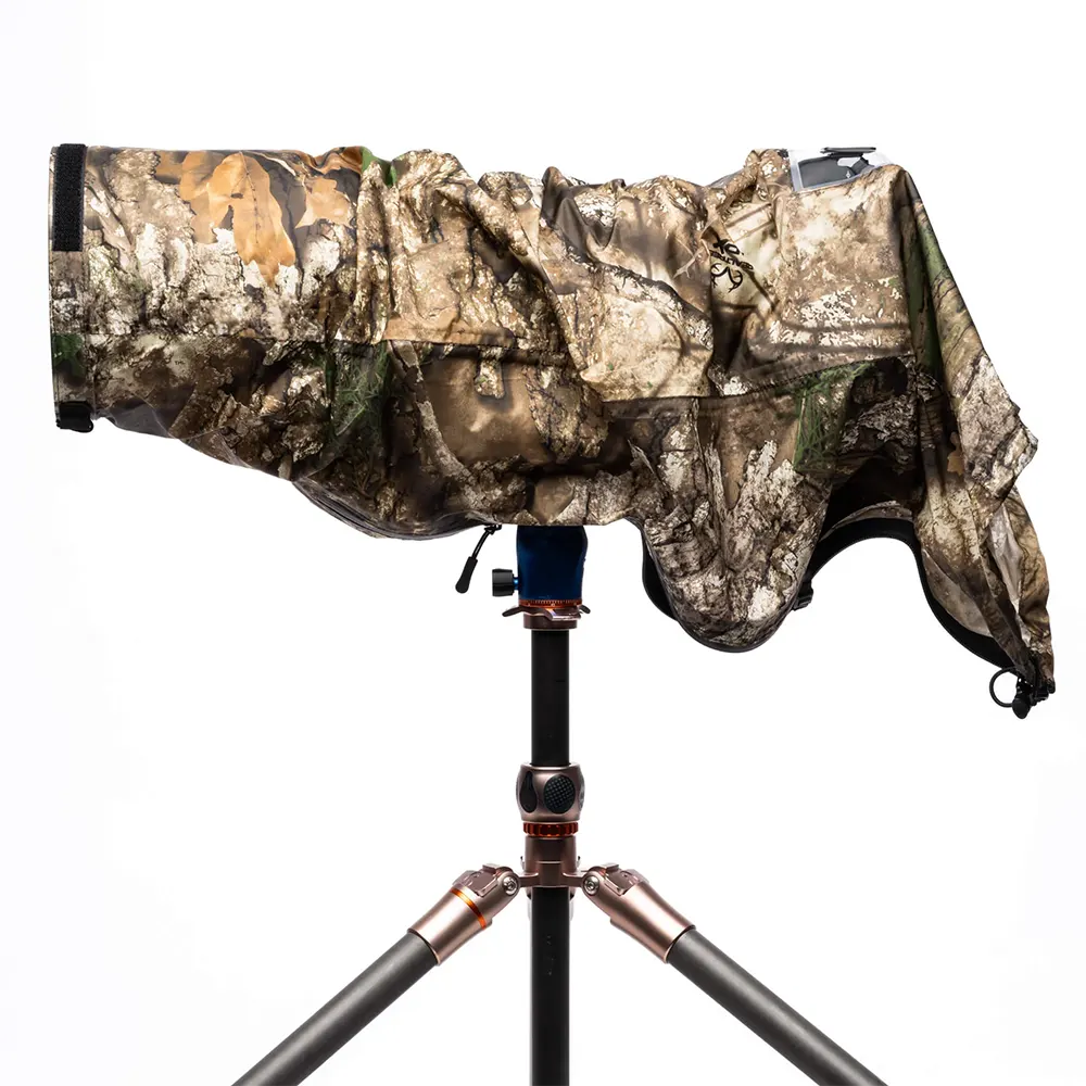 This seam-sealed rain cover protects your camera and lens even in a heavy downpour, dust or snowstorm. A zippered bottom opens up for a tripod or monopod attachment, or for better access to the focus ring. Photographers can cinch up the cover for a tight fit, loosen like a tarp, or roll it up on the lens hood so it’s at-the-ready.