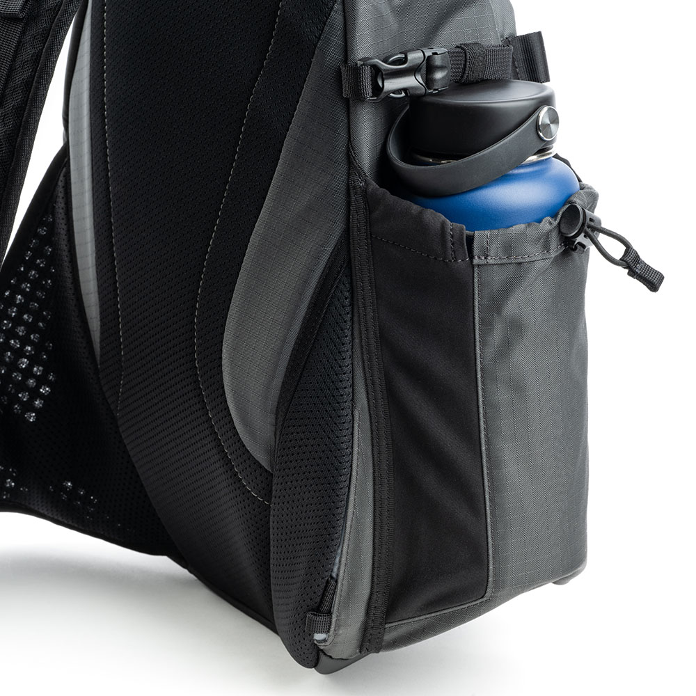 • Tall stretch pocket with strap for water bottle or compact travel tripod